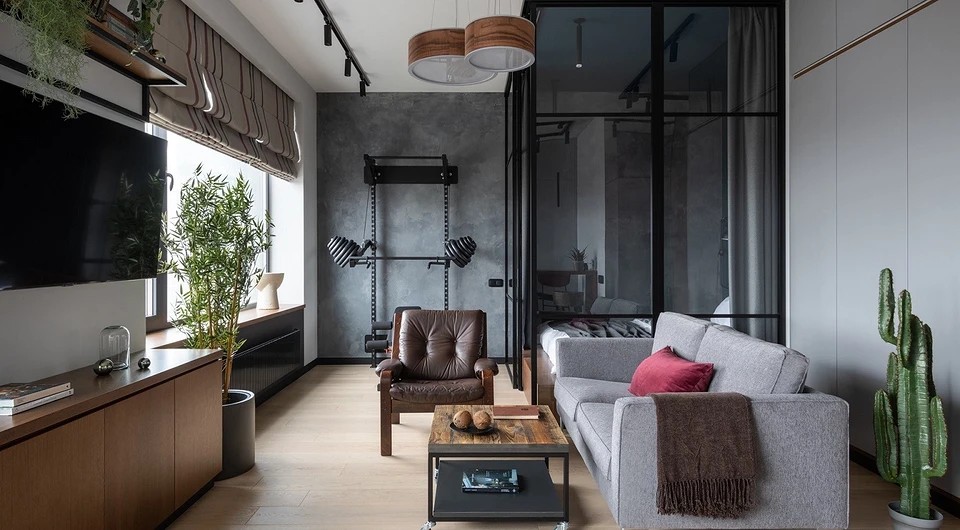 На площади чуть больше 40 квадратных метров удалось расположить просторную кухню-гостиную, уголок для спортивных занятий, спальню с полноценным местом для сна и зону для удаленной работы.