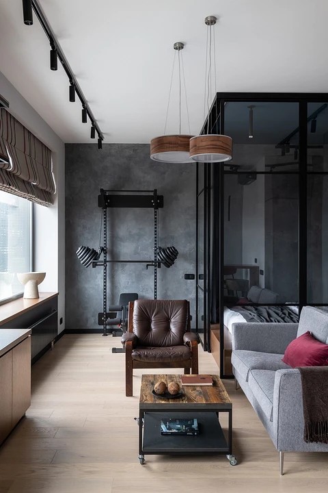Отделочные материалы служат выгодным фоном и продолжением концепции брутального интерьера. На полу в основной зоне уложена инженерная доска, стены и потолок оформлены светлой краской. В зоне кухни на полу уложили керамогранит, его же использовали для кухонного фартука. Акцентом стала стена с серой декоративной штукатуркой в зоне спортивных занятий и спальне.