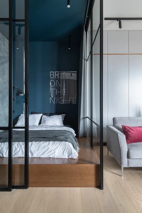 На такой площади вполне реально оформить полноценную и даже вполне просторную однокомнатную квартиру, но дизайнеры, опираясь на пожелания заказчика, предложили студийную планировку с отдельной спальной зоной, которая закрывается стеклянными перегородками.