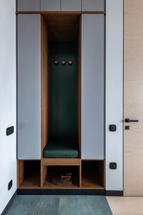 Для повседневных вещей в нишу прихожей встроен еще один шкаф — с открытыми полками для обуви, крючками и местом для сидения.