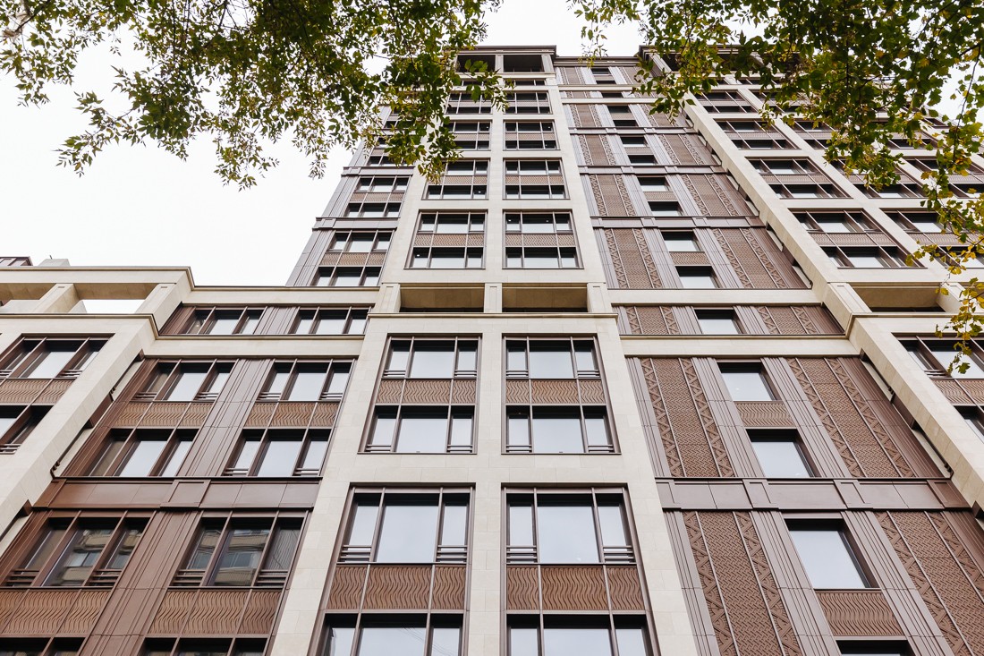 В оформлении фасадов основной акцент сделан на естественной эстетике природных материалов: здесь используется сразу 7 ценных сортов натурального камня – от светлых травертинов и юрского камня до песчаников и гранитов глубоких тонов. Жилые этажи облицованы несколькими видами керамогранита итальянского производства, входные двери в квартиры оформлены декоративными панелями Decolan (Нидерланды).