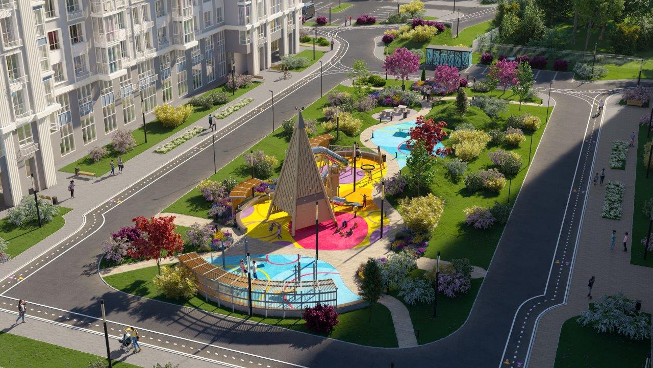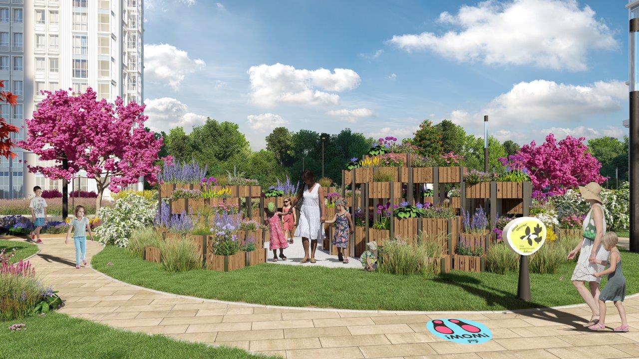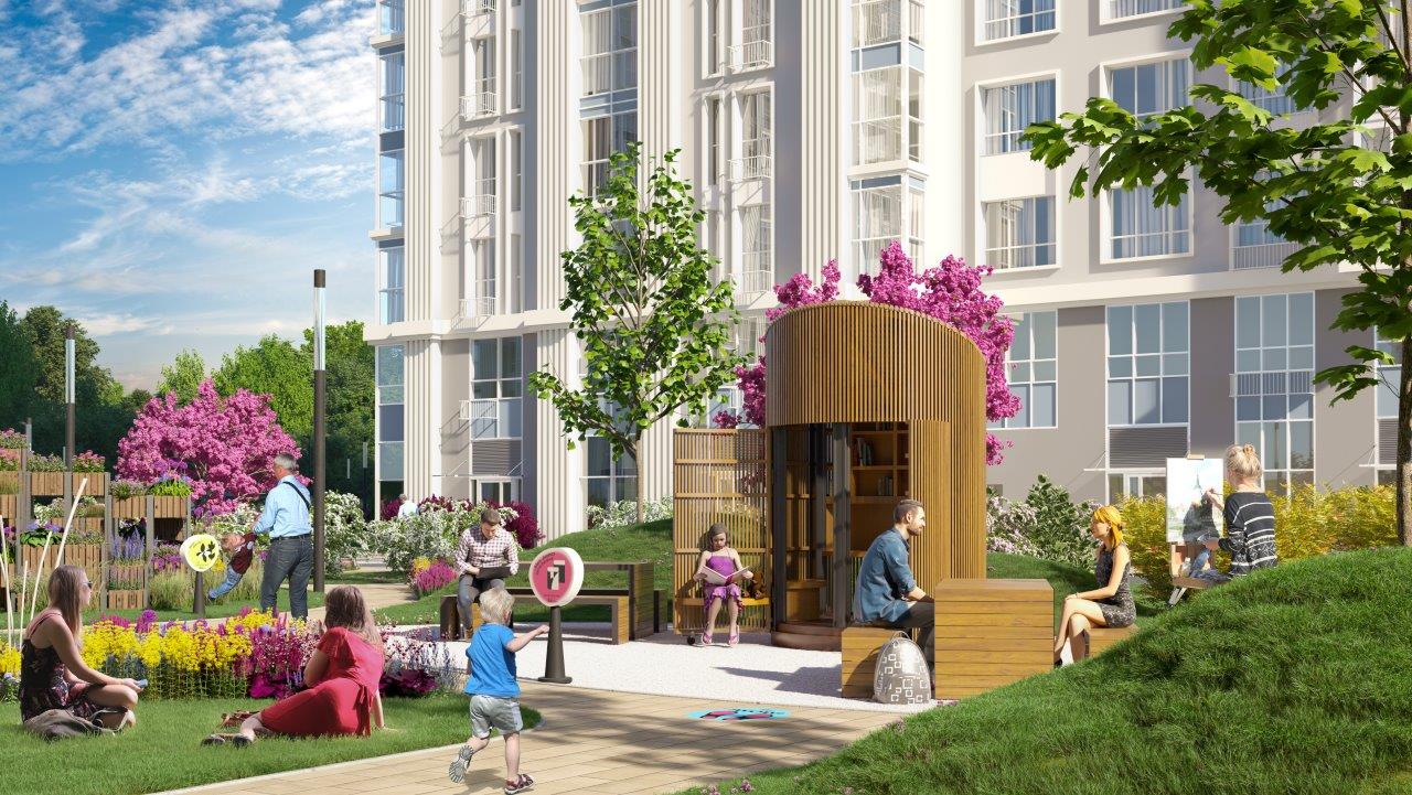 Если подробнее, то два игровых городка для малышей и детей постарше, две спортивные площадки, пространства для отдыха с навесами и уличной мебелью, барбекю-пойнты, зона с гамаками, площадки со столами для пинг-понга и настольных игр, павильон буккроссинга со встроенными скамейками для чтения. Кроме того более 100 кв.м в центре двора займет «Сад впечатлений» – композиция из разновысотных ящиков, выстроенная по принципу пчелиных сот или конструктора «Лего». В ящики будут высаживаться цветы и травы, и городские любители огородов смогут принимать участие в посадке и уходе за растениями прямо в своем дворе.