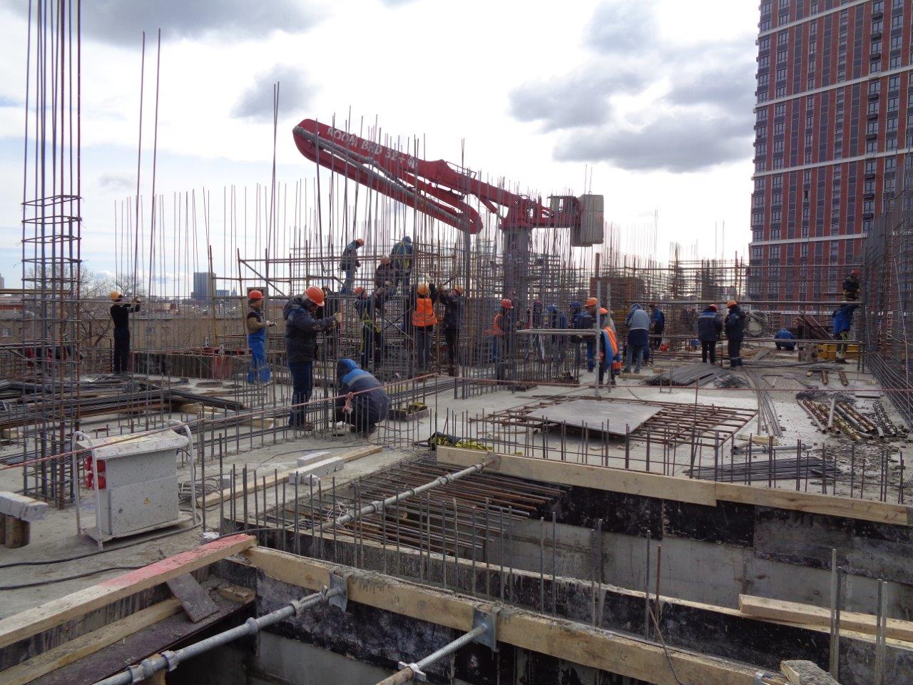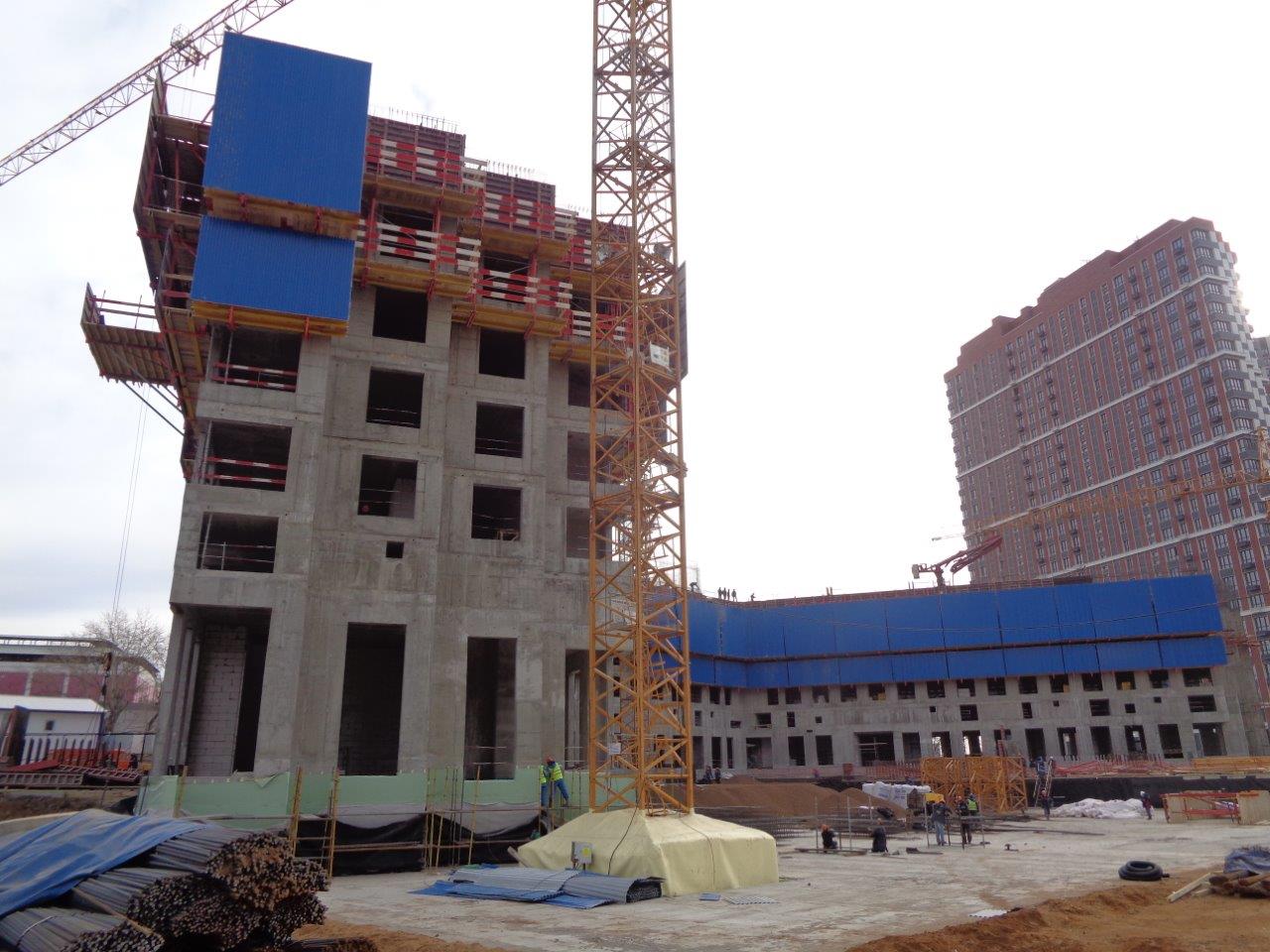Строители полностью завершили все работы в 4-х уровневой подземной части корпуса и приступили к наземной части. В настоящий момент монолитные железобетонные конструкции возводятся на уровне 6 этажа. Параллельно начаты отделочные работы технических помещений, ведется каменная кладка наземной части, а также работы по устройству инженерных сетей и прокладке наружных сетей теплоснабжения.
