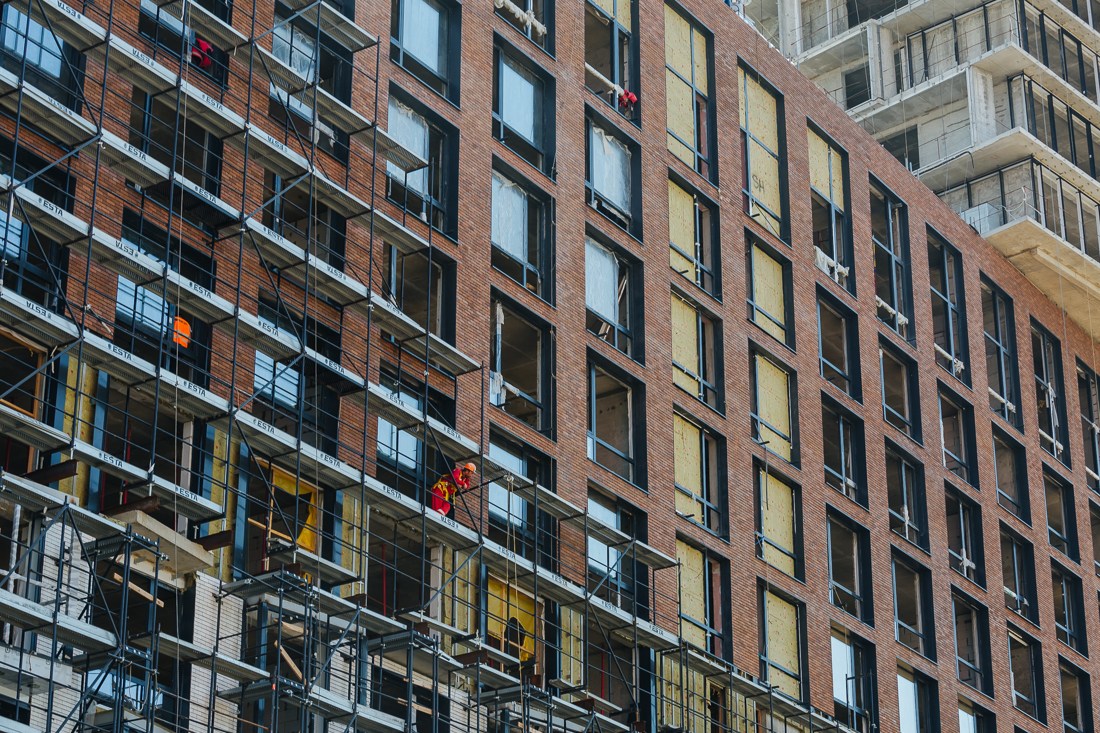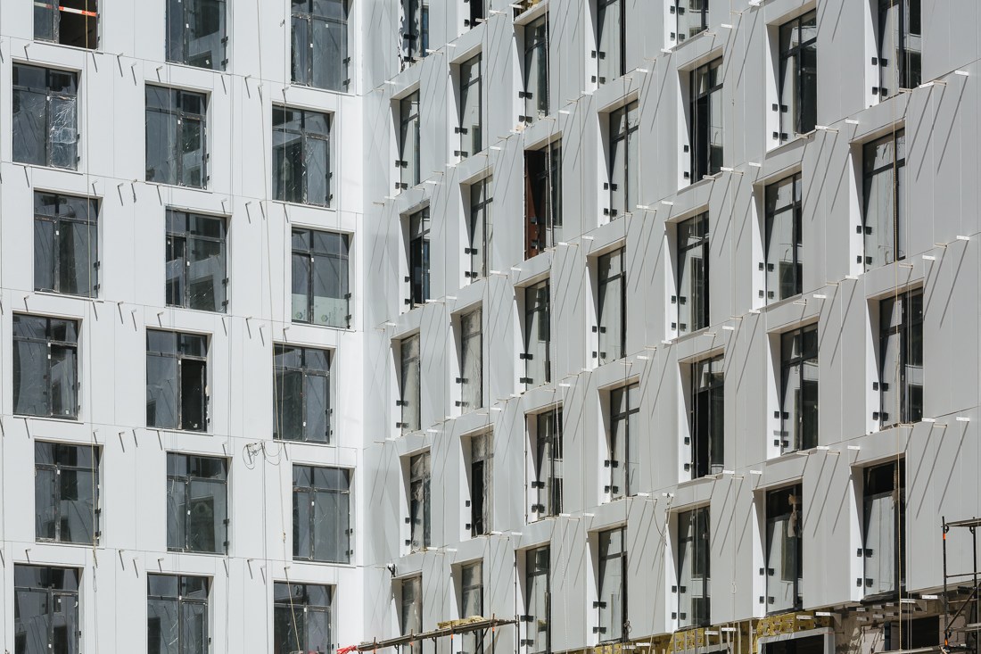 Продолжается утепление фасада и облицовка панелям компании Sibalux и плиткой Kamrock, с помощью безрамных конструкций Lumon остекляются витражи, монтируются оконные блоки фирмы Rehau.